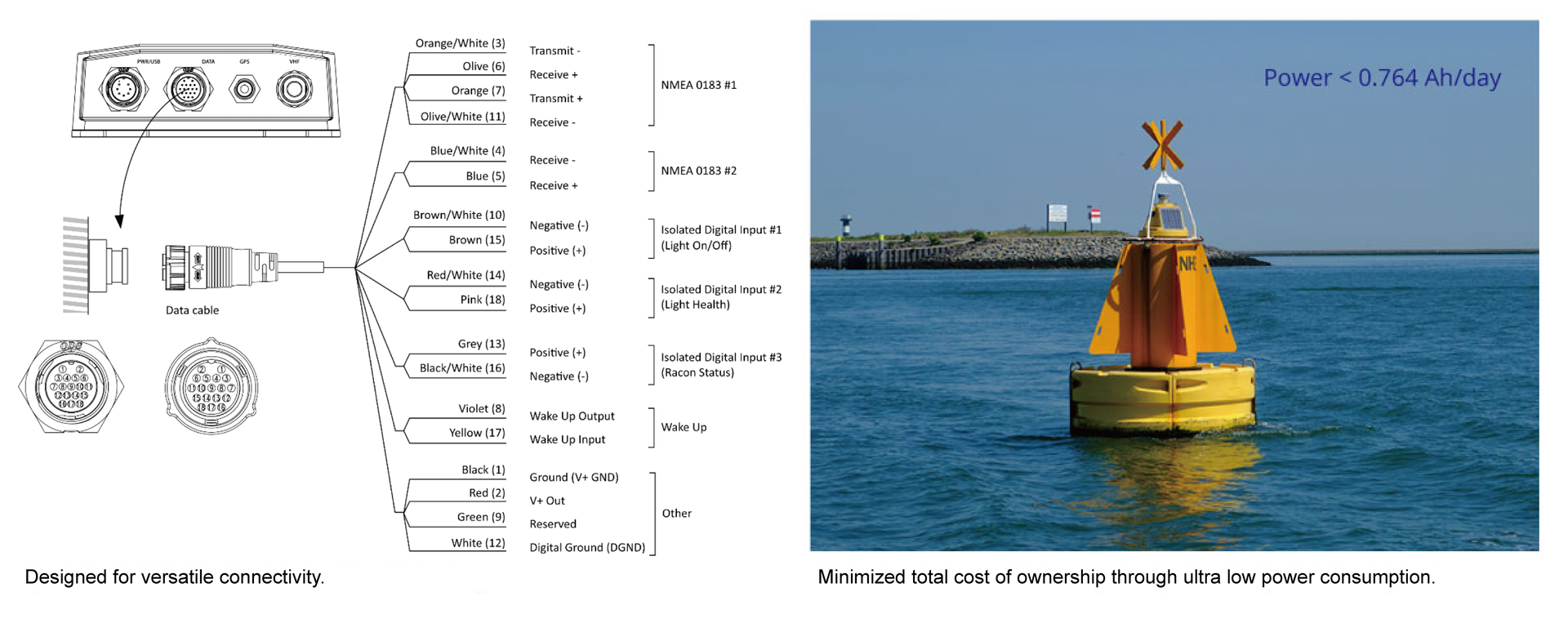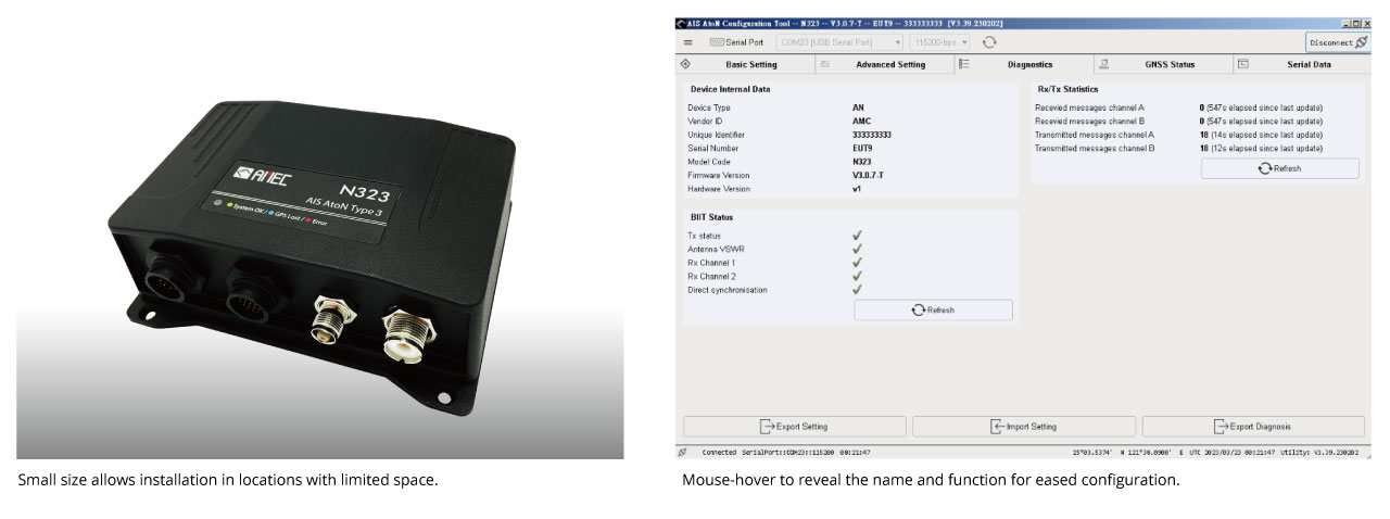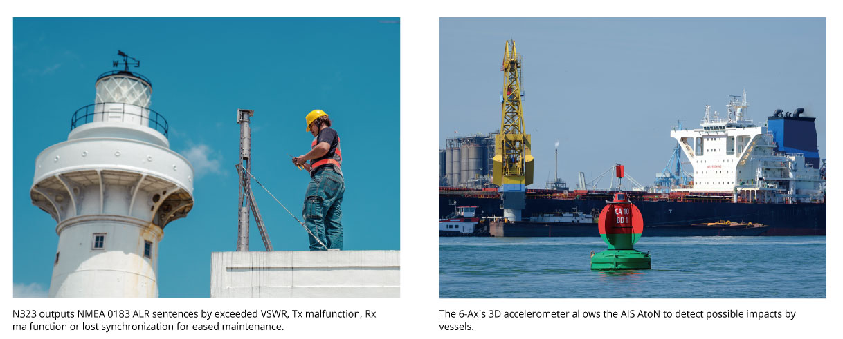 The N323 incorporates 2*NMEA 0183 ports, 3*digital inputs and wake-up port to enable connectivity with lantern and sensors at minimum power consumption. N323 consumes <0.764 Ah/day under RATDMA mode to be the world's most power-saving AIS AtoN type 3.